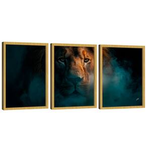 Quadro Decorativo Trio Leão na Fumaça Variação Moldura Dourada e Vidro - 60x40cm -