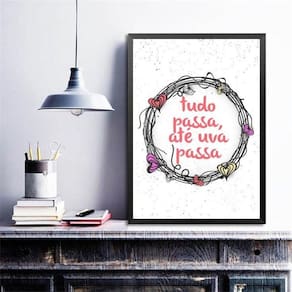 Quadro decorativo tudo passa, até uva passa 33x24cm Moldura: madeira branca Informações do produto tire todas as suas dúvidas no descritivo abaixo: decoração para quarto, sala, cozinha, escritório, área gourmet e muito mais. Chega de paredes vazias medidas - cada peça tem 33x24cm a4 . Material do papel - papel fotográfico brilhante de altíssima resolução acabamento - todos os quadros são acompanhados de uma película de acetato para proteção da imagem. - os quadros são embalados de forma segura com plástico bolha com camada dupla de acordo com o tamanho dos quadros. - de 3 meses. Meu quadro chegou. Como posso fixá-lo Você precisa apenas de um martelo e um prego, pois os quadros já vão acompanhados de penduradores. Esta é a forma mais indicada. Caso prefira, você pode utilizar uma fita dupla face neste caso, sugerimos de alta qualidade para evitar que descole e seu quadro caia . Como posso limpar meu quadro A limpeza é feita como um móvel comum da sua casa. Apenas um pano seco ou espanador são suficientes para tal Marca: Não Informado