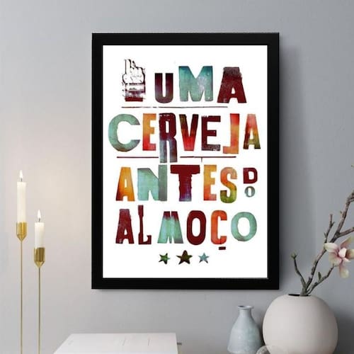Quadro decorativo uma cerveja antes do almoço 45x34cm - com vidro Cor: moldura preta Informações do produto tire todas as suas dúvidas no descritivo abaixo: decoração para quarto, sala, cozinha, escritório, área gourmet e muito mais. Chega de paredes vazias medidas - cada peça tem 45x34cm a3 . Material do papel - papel fotográfico brilhante de altíssima resolução acabamento - todos os quadros são acompanhados de vidro para proteção da imagem. - moldura em madeira maciça na cor preta ou branca conforme produto escolhido e pendurador . - os quadros são embalados de forma segura com plástico bolha com camada dupla de acordo com o tamanho dos quadros. Garantia - garantia de 3 meses. Meu quadro chegou. Como posso fixá-lo Você precisa apenas de um martelo e um prego, pois os quadros já vão acompanhados de penduradores. Esta é a forma mais indicada. Como posso limpar meu quadro A limpeza é feita como um móvel comum da sua casa. Apenas um pano seco ou espanador são suficientes para tal