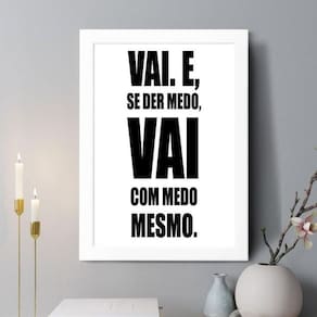 Quadro decorativo vai e se der medo 33x24cm - com vidro Cor: moldura branca Informações do produto tire todas as suas dúvidas no descritivo abaixo: decoração para quarto, sala, cozinha, escritório, área gourmet e muito mais. Chega de paredes vazias medidas - cada peça tem 33x24cm a4 . Material do papel - papel fotográfico brilhante de altíssima resolução acabamento - todos os quadros são acompanhados de vidro para proteção da imagem. - moldura em madeira maciça na cor preta ou branca conforme produto escolhido e pendurador . - os quadros são embalados de forma segura com plástico bolha com camada dupla de acordo com o tamanho dos quadros. Garantia - garantia de 3 meses. Meu quadro chegou. Como posso fixá-lo Você precisa apenas de um martelo e um prego, pois os quadros já vão acompanhados de penduradores. Esta é a forma mais indicada. Como posso limpar meu quadro A limpeza é feita como um móvel comum da sua casa. Apenas um pano seco ou espanador são suficientes para tal