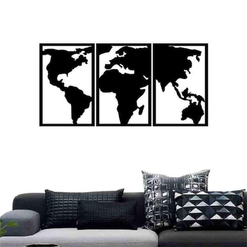 O Quadro Decorativo Vazado Mapa Mundi Político irá trazer um toque requintado para o seu ambiente. O quadro é produzido em MDF com 6mm de espessura cortado a laser. Suas bordas na cor preta é feito pela própria máquina de corte a laser, dando o acabamento impecável.O quadro é composto por três peças que juntas formam uma linda imagem. Para deixá-los perfeitos em sua parede deixe um espaço com cerca de 1cm entre uma peça e outra, assim você terá um resultado fantástico. O quadro se encaixa bem em qualquer ambiente, com sofisticação e design, esse quadro é a peça chave para tornar seu lar mais aconchegante. Características:- 3 quadros com tamanho total de 122x60cm- Indicado espaçamento de 1cm entre as peças- Produzido em mdf com 6mm de espessura- Corte e acabamento a laser Especificações Técnicas:Produto: Quadro decorativoMarca: DecoartsQuantidade: 3 peçasMaterial: MDFTamanho total CxA : 122x60cmTamanho de cada peça: 40x60 cmCor: PretoModelo: Mapa Mundi PolíticoConteúdo da embalagem: 1 quadro composto por 3 peçasFormas de Instalação:A instalação dos quadros é simples e prática, não é necessário fazer sujeita e barulho furando a parede para instalar. Os quadros acompanham fita dupla face no verso de cada quadro, basta destacar a fita protetora e fixar no local desejado.Limpeza e Manutenção: Para limpeza, utilize apenas um pano umedecido com água, não utilize produtos químicos para garantir a durabilidade das peças.