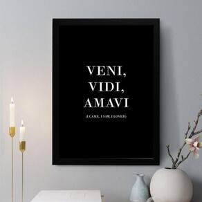 Quadro decorativo veni vidi amavi 45x34cm Cor: moldura preta Informações do produto tire todas as suas dúvidas no descritivo abaixo: decoração para quarto, sala, cozinha, escritório, área gourmet e muito mais. Chega de paredes vazias. Medidas - cada peça tem 45x34cm a3 . Material do papel - papel fotográfico brilhante de altíssima resolução acabamento - todos os quadros são acompanhados de uma película de acetato para proteção da imagem. - os quadros são embalados de forma segura com plástico bolha com camada dupla de acordo com o tamanho dos quadros. Garantia - garantia de 3 meses. Meu quadro chegou. Como posso fixá-lo Você precisa apenas de um martelo e um prego, pois os quadros já vão acompanhados de penduradores. Esta é a forma mais indicada. Caso prefira, você pode utilizar uma fita dupla face neste caso, sugerimos de alta qualidade para evitar que descole e seu quadro caia . Como posso limpar meu quadro A limpeza é feita como um móvel comum da sua casa. Apenas um pano seco ou espanador são suficientes para tal