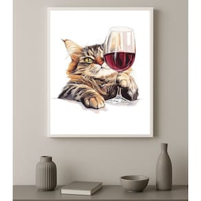 Quadro Decorativo Vinho - Gato Com Taça 24x18cm - Cor: Moldura branca