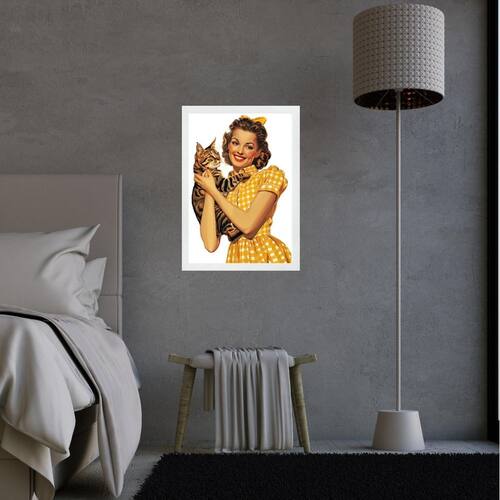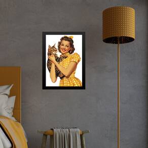 Quadro decorativo vintage pin up com gato 45x34cm - com vidro Cor: moldura branca Informações do produto tire todas as suas dúvidas no descritivo abaixo: decoração para quarto, sala, cozinha, escritório, área gourmet e muito mais. Chega de paredes vazias medidas - cada peça tem 45x34cm a3 . Material do papel - papel fotográfico brilhante de altíssima resolução acabamento - todos os quadros são acompanhados de vidro para proteção da imagem. - moldura em madeira maciça na cor preta ou branca conforme produto escolhido e pendurador . - os quadros são embalados de forma segura com plástico bolha com camada dupla de acordo com o tamanho dos quadros. - de 3 meses. Meu quadro chegou. Como posso fixá-lo Você precisa apenas de um martelo e um prego, pois os quadros já vão acompanhados de penduradores. Esta é a forma mais indicada. Como posso limpar meu quadro A limpeza é feita como um móvel comum da sua casa. Apenas um pano seco ou espanador são suficientes para tal