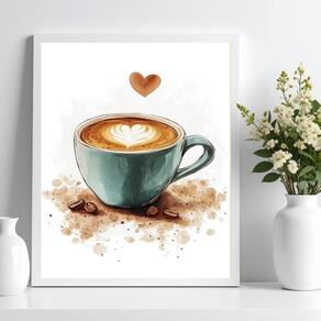 Quadro Decorativo Xícara de Café Aquarela Coração 45x34cm - com vidro - Cor: Moldura branca