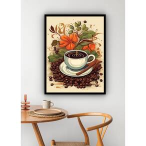 Quadro Decorativo Xícara De Café Com Flores - 70x50cm - Cor: Moldura Branca