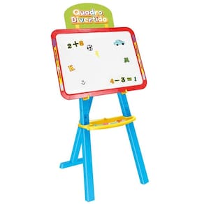 O Quadro Divertido 2 em 1 vem com canetinhas para quadro branco, apagador, letras, números e sinais matemáticos magnéticos e gizes coloridos para desenhar no quadro negro. Perfeito para o uso em casa ou na escola!