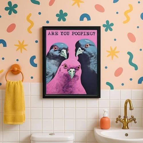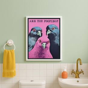 Quadro divertido para banheiro pombos pooping 45x34cm Cor: moldura preta Informações do produto tire todas as suas dúvidas no descritivo abaixo: decoração para quarto, sala, cozinha, escritório, área gourmet e muito mais. Chega de paredes vazias. Medidas - cada peça tem 45x34cm a3 . Material do papel - papel fotográfico brilhante de altíssima resolução acabamento - todos os quadros são acompanhados de uma película de acetato para proteção da imagem. - os quadros são embalados de forma segura com plástico bolha com camada dupla de acordo com o tamanho dos quadros. - de 3 meses. Meu quadro chegou. Como posso fixá-lo Você precisa apenas de um martelo e um prego, pois os quadros já vão acompanhados de penduradores. Esta é a forma mais indicada. Caso prefira, você pode utilizar uma fita dupla face neste caso, sugerimos de alta qualidade para evitar que descole e seu quadro caia . Como posso limpar meu quadro A limpeza é feita como um móvel comum da sua casa. Apenas um pano seco ou espanador são suficientes para tal Marca: Não Informado