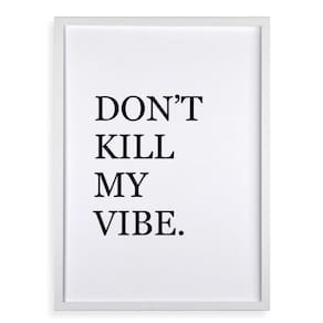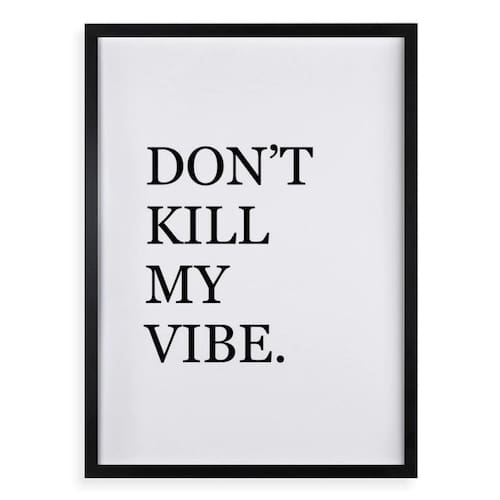 Quadro don't kill my vibe 24x18cm Cor: moldura branca Informações do produto tire todas as suas dúvidas no descritivo abaixo: decoração para quarto, sala, cozinha, escritório, área gourmet e muito mais. Chega de paredes vazias medidas - cada peça tem 24x18cm a5 . Material do papel - papel fotográfico brilhante de altíssima resolução acabamento - todos os quadros são acompanhados de uma película de acetato para proteção da imagem. - os quadros são embalados de forma segura com plástico bolha com camada dupla de acordo com o tamanho dos quadros. - de 3 meses. Meu quadro chegou. Como posso fixá-lo Você precisa apenas de um martelo e um prego, pois os quadros já vão acompanhados de penduradores. Esta é a forma mais indicada. Caso prefira, você pode utilizar uma fita dupla face neste caso, sugerimos de alta qualidade para evitar que descole e seu quadro caia . Como posso limpar meu quadro A limpeza é feita como um móvel comum da sua casa. Apenas um pano seco ou espanador são suficientes para tal