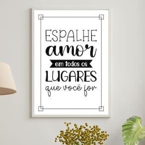 Quadro espalhe amor em todos os lugares 33x24cm - com vidro Moldura: madeira preta Informações do produto tire todas as suas dúvidas no descritivo abaixo: decoração para quarto, sala, cozinha, escritório, área gourmet e muito mais. Chega de paredes vazias medidas - cada peça tem 33x24cm a4 . Material do papel - papel fotográfico brilhante de altíssima resolução acabamento - todos os quadros são acompanhados de vidro para proteção da imagem. - moldura em madeira maciça na cor preta ou branca conforme produto escolhido e pendurador . - os quadros são embalados de forma segura com plástico bolha com camada dupla de acordo com o tamanho dos quadros. Garantia - garantia de 3 meses. Meu quadro chegou. Como posso fixá-lo Você precisa apenas de um martelo e um prego, pois os quadros já vão acompanhados de penduradores. Esta é a forma mais indicada. Como posso limpar meu quadro A limpeza é feita como um móvel comum da sua casa. Apenas um pano seco ou espanador são suficientes para tal
