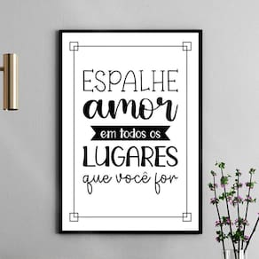 Quadro espalhe amor em todos os lugares 33x24cm Moldura: madeira branca Informações do produto tire todas as suas dúvidas no descritivo abaixo: decoração para quarto, sala, cozinha, escritório, área gourmet e muito mais. Chega de paredes vazias medidas - cada peça tem 33x24cm a4 . Material do papel - papel fotográfico brilhante de altíssima resolução acabamento - todos os quadros são acompanhados de uma película de acetato para proteção da imagem. - os quadros são embalados de forma segura com plástico bolha com camada dupla de acordo com o tamanho dos quadros. Garantia - garantia de 3 meses. Meu quadro chegou. Como posso fixá-lo Você precisa apenas de um martelo e um prego, pois os quadros já vão acompanhados de penduradores. Esta é a forma mais indicada. Caso prefira, você pode utilizar uma fita dupla face neste caso, sugerimos de alta qualidade para evitar que descole e seu quadro caia . Como posso limpar meu quadro A limpeza é feita como um móvel comum da sua casa. Apenas um pano seco ou espanador são suficientes para tal Ean: 7896641323829