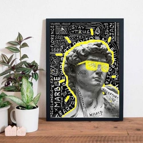 Quadro estátua grega pop art 33x24cm Moldura: madeira preta Informações do produto Decoração para quarto, sala, cozinha, escritório, área gourmet e muito mais. Chega de paredes vazias Medidas - cada peça tem 33x24cm a4 . Material do papel - papel fotográfico brilhante de altíssima resolução Acabamento - todos os quadros são acompanhados de uma película de acetato para proteção da imagem. - Os quadros são embalados de forma segura com plástico bolha com camada dupla de acordo com o tamanho dos quadros. - de 3 meses. Meu quadro chegou. Como posso fixá-lo Você precisa apenas de um martelo e um prego, pois os quadros já vão acompanhados de penduradores. Esta é a forma mais indicada. Caso prefira, você pode utilizar uma fita dupla face neste caso, sugerimos de alta qualidade para evitar que descole e seu quadro caia . Como posso limpar meu quadro A limpeza é feita como um móvel comum da sua casa. Apenas um pano seco ou espanador são suficientes para tal