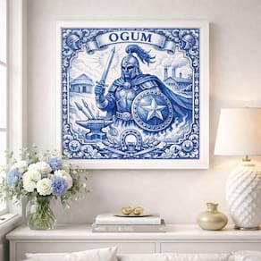 Quadro Estilo Azulejo Ogum 33x33cm Mold Preta Vidro