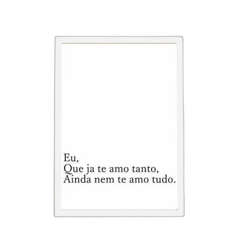 Quadro eu que já te amo tanto 24x18cm Moldura: madeira branca Informações do produto tire todas as suas dúvidas no descritivo abaixo: decoração para quarto, sala, cozinha, escritório, área gourmet e muito mais. Chega de paredes vazias medidas - cada peça tem 24x18cm a5 . Material do papel - papel fotográfico brilhante de altíssima resolução acabamento - todos os quadros são acompanhados de uma película de acetato para proteção da imagem. - moldura em madeira maciça na cor branca e pendurador móvel que pode ser retirado facilmente caso deseje fixar com fita dupla face. - os quadros são embalados de forma segura com plástico bolha com camada dupla de acordo com o tamanho dos quadros. - de 3 meses prazo de envio pedimos 24 horas úteis no máximo para enviar seu pedido após o envio, segue os prazos normais dos correios, cerca de 7 dias úteis exceto para norte e nordeste, que pode ser de até 14 dias úteis. Em diversas cidades, este prazo normalmente é reduzido, mas depende do prazo dos correios. Meu quadro chegou. Como posso fixá-lo Você precisa apenas de um martelo e um prego, pois os quadros já vão acompanhados de penduradores. Esta é a forma mais indicada. Caso prefira, você pode utilizar uma fita dupla face neste caso, sugerimos de alta qualidade para evitar que descole e seu quadro caia . Como posso limpar meu quadro A limpeza é feita como um móvel comum da sua casa. Apenas um pano seco ou espanador são suficientes para tal