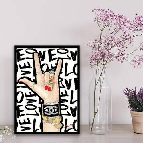 Quadro feminino rock love fashion 24x18cm - com vidro Moldura: madeira preta