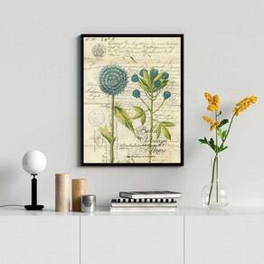 Quadro Flores Azuis Botânica Retrô 45x34cm - Vidro - Madeira Preta