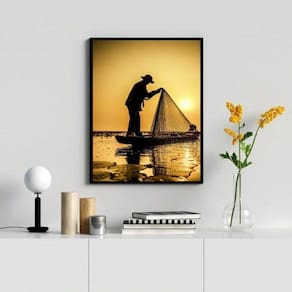 Quadro fotografia pescador- por do sol 45x34cm Moldura: madeira branca Informações do produto tire todas as suas dúvidas no descritivo abaixo: decoração para quarto, sala, cozinha, escritório, área gourmet e muito mais. Chega de paredes vazias. Medidas - cada peça tem 45x34cm a3 . Material do papel - papel fotográfico brilhante de altíssima resolução acabamento - todos os quadros são acompanhados de uma película de acetato para proteção da imagem. - os quadros são embalados de forma segura com plástico bolha com camada dupla de acordo com o tamanho dos quadros. Garantia - garantia de 3 meses. Meu quadro chegou. Como posso fixá-lo Você precisa apenas de um martelo e um prego, pois os quadros já vão acompanhados de penduradores. Esta é a forma mais indicada. Caso prefira, você pode utilizar uma fita dupla face neste caso, sugerimos de alta qualidade para evitar que descole e seu quadro caia . Como posso limpar meu quadro A limpeza é feita como um móvel comum da sua casa. Apenas um pano seco ou espanador são suficientes para tal Ean: 7890527664259