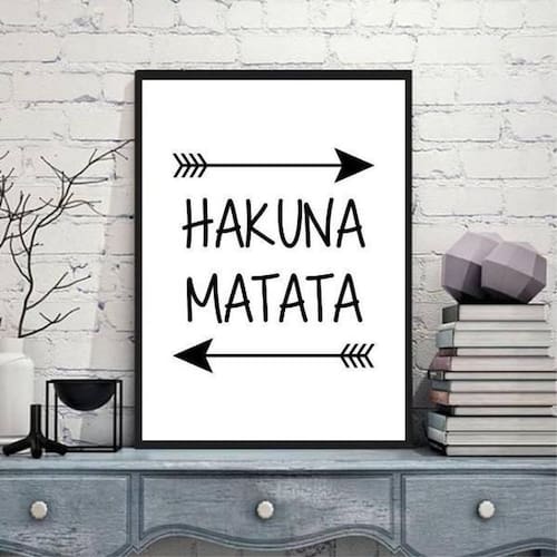 Quadro frase hakuna matata 24x18cm - com vidro Moldura: madeira preta Informações do produto Decoração para quarto, sala, cozinha, escritório, área gourmet e muito mais. Chega de paredes vazias Medidas - cada peça tem 24x18cm a5 . Material do papel - papel fotográfico brilhante de altíssima resolução Acabamento - todos os quadros são acompanhados de vidro para proteção da imagem. - Moldura em madeira maciça na cor preta e pendurador. - Os quadros são embalados de forma segura com plástico bolha com camada dupla de acordo com o tamanho dos quadros. - de 3 meses. Meu quadro chegou. Como posso fixá-lo Você precisa apenas de um martelo e um prego, pois os quadros já vão acompanhados de penduradores. Esta é a forma mais indicada. Como posso limpar meu quadro A limpeza é feita como um móvel comum da sua casa. Apenas um pano seco ou espanador são suficientes para tal