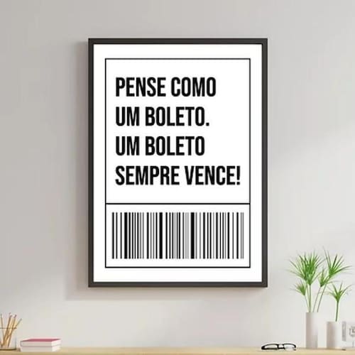 Quadro frase pense como um boleto 33x24cm Moldura: madeira preta Informações do produto Decoração para quarto, sala, cozinha, escritório, área gourmet e muito mais. Chega de paredes vazias Medidas - cada peça tem 33x24cm a4 . Material do papel - papel fotográfico brilhante de altíssima resolução acabamento - Todos os quadros são acompanhados de uma película de acetato para proteção da imagem. - Os quadros são embalados de forma segura com plástico bolha com camada dupla de acordo com o tamanho dos quadros. - de 3 meses. Meu quadro chegou. Como posso fixá-lo Você precisa apenas de um martelo e um prego, pois os quadros já vão acompanhados de penduradores. Esta é a forma mais indicada. Caso prefira, você pode utilizar uma fita dupla face neste caso, sugerimos de alta qualidade para evitar que descole e seu quadro caia . Como posso limpar meu quadro A limpeza é feita como um móvel comum da sua casa. Apenas um pano seco ou espanador são suficientes para tal Marca: Não Informado