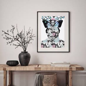 Quadro frida borboleta - 60x48cm Moldura: madeira branca Informações do produto tire todas as suas dúvidas no descritivo abaixo: decoração para quarto, sala, cozinha, escritório, área gourmet e muito mais. Chega de paredes vazias medidas - cada peça tem 60x48cm . Material do papel - papel fotográfico brilhante de altíssima resolução acabamento - todos os quadros são acompanhados de vidro para proteção da imagem. - moldura em madeira maciça na cor preta ou branca conforme produto escolhido e pendurador. - paspatur branco com 7cm de largura - os quadros são embalados de forma segura com plástico bolha com camada dupla de acordo com o tamanho dos quadros. Garantia - garantia de 3 meses. Meu quadro chegou. Como posso fixá-lo Você precisa apenas de um martelo e um prego, pois os quadros já vão acompanhados de penduradores. Esta é a forma mais indicada. Como posso limpar meu quadro A limpeza é feita como um móvel comum da sua casa. Apenas um pano seco ou espanador são suficientes para tal