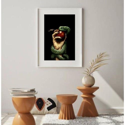 Quadro fruto proibido- serpente maçã 24x18cm - com vidro Moldura: madeira branca Informações do produto tire todas as suas dúvidas no descritivo abaixo: decoração para quarto, sala, cozinha, escritório, área gourmet e muito mais. Chega de paredes vazias medidas - cada peça tem 24x18cm a5 . Material do papel - papel fotográfico brilhante de altíssima resolução acabamento - todos os quadros são acompanhados de vidro para proteção da imagem. - moldura em madeira maciça na cor preta ou branca conforme produto escolhido e pendurador . - os quadros são embalados de forma segura com plástico bolha com camada dupla de acordo com o tamanho dos quadros. Garantia - garantia de 3 meses. Meu quadro chegou. Como posso fixá-lo Você precisa apenas de um martelo e um prego, pois os quadros já vão acompanhados de penduradores. Esta é a forma mais indicada. Como posso limpar meu quadro A limpeza é feita como um móvel comum da sua casa. Apenas um pano seco ou espanador são suficientes para tal