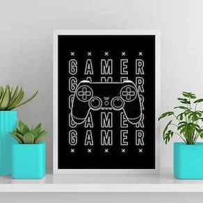Quadro gamer console preto e branco 33x24cm - com vidro Moldura: madeira preta Informações do produto tire todas as suas dúvidas no descritivo abaixo: decoração para quarto, sala, cozinha, escritório, área gourmet e muito mais. Chega de paredes vazias medidas - cada peça tem 33x24cm a4 . Material do papel - papel fotográfico brilhante de altíssima resolução acabamento - todos os quadros são acompanhados de vidro para proteção da imagem. - moldura em madeira maciça na cor preta e pendurador . - os quadros são embalados de forma segura com plástico bolha com camada dupla de acordo com o tamanho dos quadros. Você precisa apenas de um martelo e um prego, pois os quadros já vão acompanhados de penduradores. Esta é a forma mais indicada. Como posso limpar meu quadro A limpeza é feita como um móvel comum da sua casa. Apenas um pano seco ou espanador são suficientes para tal Ean: 7895145478578
