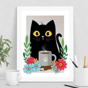 Especificações técnicas: - Título: Quadro Decorativo Gato Com Caneca De Café - Material: Papel fotográfico brilhante de altíssima resolução - Medidas: 24x18cm A5 - Moldura: Madeira preta - Acompanha vidro para proteção da imagem - Acompanha penduradores para fixação - Garantia: 3 meses