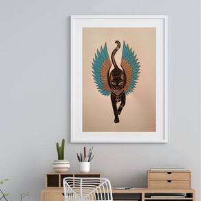 Quadro gato egípcio bastet - 60x48cm Moldura: madeira branca Informações do produto tire todas as suas dúvidas no descritivo abaixo: decoração para quarto, sala, cozinha, escritório, área gourmet e muito mais. Chega de paredes vazias medidas - cada peça tem 60x48cm . Material do papel - papel fotográfico brilhante de altíssima resolução acabamento - todos os quadros são acompanhados de vidro para proteção da imagem. - moldura em madeira maciça na cor preta ou branca conforme produto escolhido e pendurador. - paspatur branco com 7cm de largura - os quadros são embalados de forma segura com plástico bolha com camada dupla de acordo com o tamanho dos quadros. Garantia - garantia de 3 meses. Meu quadro chegou. Como posso fixá-lo Você precisa apenas de um martelo e um prego, pois os quadros já vão acompanhados de penduradores. Esta é a forma mais indicada. Como posso limpar meu quadro A limpeza é feita como um móvel comum da sua casa. Apenas um pano seco ou espanador são suficientes para tal