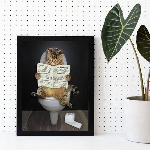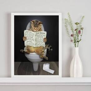 Quadro gato no banheiro lendo jornal 24x18cm Moldura: madeira branca Informações do produto tire todas as suas dúvidas no descritivo abaixo: decoração para quarto, sala, cozinha, escritório, área gourmet e muito mais. Chega de paredes vazias medidas - cada peça tem 24x18cm a5 . Material do papel - papel fotográfico brilhante de altíssima resolução acabamento - todos os quadros são acompanhados de uma película de acetato para proteção da imagem. - os quadros são embalados de forma segura com plástico bolha com camada dupla de acordo com o tamanho dos quadros. Garantia - garantia de 3 meses. Meu quadro chegou. Como posso fixá-lo Você precisa apenas de um martelo e um prego, pois os quadros já vão acompanhados de penduradores. Esta é a forma mais indicada. Caso prefira, você pode utilizar uma fita dupla face neste caso, sugerimos de alta qualidade para evitar que descole e seu quadro caia . Como posso limpar meu quadro A limpeza é feita como um móvel comum da sua casa. Apenas um pano seco ou espanador são suficientes para tal