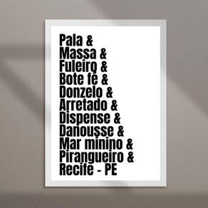 Quadro gírias de recife - pernambuco 33x24cm - com vidro Cor: moldura preta Informações do produto tire todas as suas dúvidas no descritivo abaixo: decoração para quarto, sala, cozinha, escritório, área gourmet e muito mais. Chega de paredes vazias medidas - cada peça tem 33x24cm a4 . Material do papel - papel fotográfico brilhante de altíssima resolução acabamento - todos os quadros são acompanhados de vidro para proteção da imagem. - moldura em madeira maciça na cor preta ou branca conforme produto escolhido e pendurador . - os quadros são embalados de forma segura com plástico bolha com camada dupla de acordo com o tamanho dos quadros. Garantia - garantia de 3 meses. Meu quadro chegou. Como posso fixá-lo Você precisa apenas de um martelo e um prego, pois os quadros já vão acompanhados de penduradores. Esta é a forma mais indicada. Como posso limpar meu quadro A limpeza é feita como um móvel comum da sua casa. Apenas um pano seco ou espanador são suficientes para tal