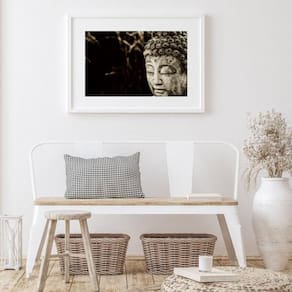 Quadro horizontal buda - 60x48cm Moldura: madeira branca Informações do produto tire todas as suas dúvidas no descritivo abaixo: decoração para quarto, sala, cozinha, escritório, área gourmet e muito mais. Chega de paredes vazias medidas - cada peça tem 60x48cm . Material do papel - papel fotográfico brilhante de altíssima resolução acabamento - todos os quadros são acompanhados de vidro para proteção da imagem. - moldura em madeira maciça na cor preta ou branca conforme produto escolhido e pendurador. - paspatur branco com 7cm de largura - os quadros são embalados de forma segura com plástico bolha com camada dupla de acordo com o tamanho dos quadros. Garantia - garantia de 3 meses. Meu quadro chegou. Como posso fixá-lo Você precisa apenas de um martelo e um prego, pois os quadros já vão acompanhados de penduradores. Esta é a forma mais indicada. Como posso limpar meu quadro A limpeza é feita como um móvel comum da sua casa. Apenas um pano seco ou espanador são suficientes para tal