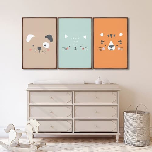Quadro Infantil Decorativo Rostinhos do Bem Gato Cachorro Tigre com 3 Telas cm de Parede para Sala, Quarto de Criança, Quarto de Bebê, Brinquedoteca, Escola, Creche, Sala de Jogos, Hall, Salão de Festas, Berçário, Maternidade.?Especificações Técnicas:Modelo: Rostinhos do Bem;Medidas: cm;Material da Imagem: Papel premium fotográfico de alta qualidade;Material da Moldura: Madeira de reflorestamento revestida;Espessura da Moldura: 2,7cm de profundidade e 1,5cm frontal;Acabamento: Fita Kraft;Acompanha: Suporte de serrilha para quadros e parafusos.Transforme o espaço de sua criança com criatividade! Não perca a oportunidade de adquirir o exclusivo Quadro Decorativo Rostinhos do Bem com 3 Telas a um preço incrível! Acompanha Fixação para Parede: Sim Ambiente Principal: Sala de Estar Cor: Marrom Cor do Produto: Marrom Espessura: 20 mm Espessura do Vidro: 3 mm Itens Inclusos: Quadro com 3 telas Marca: ARTE PRÓPRIA Material Principal: Madeira Maciça Medida de Cada Item: 60cm x 90cm Origem do Produto: Nacional Peso: 15 kg Possui Paspatur: Não Possui Vidro: Sim Tema da Estampa: Infantil Tipo de Quadro: Kit de quadros Vidro é Anti-Reflexo: Não Marca: ARTE PRÓPRIA