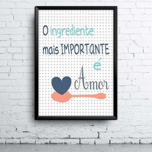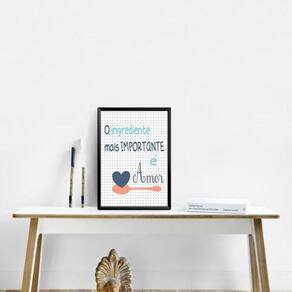 Quadro Ingrediente Amor A4 Quadro com moldura em madeira. Fita dupla face para pendurar sem sujeira. Este produto é a opção ideal para quem deseja comodidade na hora de decorar. informações do produto Moldura com 2cm de largura em madeira pinus com excelente acabamento fosco e arte impressa em vinil fosco alta durabilidade. Acompanha fita dupla face já instalada para pendurar a moldura e embalagem protetora com cantoneiras que evitam danos durante o transporte. Opções de formatos A4: gravuras no tamanho 21x30cm - medida externa: 24x33cm Prazo de produção: 03 a 05 dias úteis após aprovação do pagamento. As cores podem ter pequenas variações em relação a imagem do seu monitor. As medidas podem sofrer mínimas variações. Marca: Sdesign