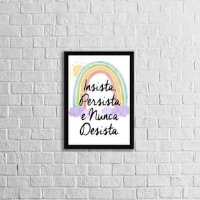 Quadro Insista, Persista E Nunca Desista 24X18Cm Moldura: madeira branca Informações do produto Decoração para quarto, sala, cozinha, escritório, área gourmet e muito mais. Chega de paredes vazias. Medidas - cada peça tem 24x18cm a5 . Material do papel - papel fotográfico brilhante de altíssima resolução Acabamento - todos os quadros são acompanhados de uma película de acetato para proteção da imagem. - moldura em madeira maciça na cor branca e pendurador móvel que pode ser retirado facilmente caso deseje fixar com fita dupla face. - os quadros são embalados de forma segura com plástico bolha com camada dupla de acordo com o tamanho dos quadros. - de 3 meses Meu quadro chegou. Como posso fixá-lo: Você precisa apenas de um martelo e um prego, pois os quadros já vão acompanhados de penduradores. Esta é a forma mais indicada. Caso prefira, você pode utilizar uma fita dupla face neste caso, sugerimos de alta qualidade para evitar que descole e seu quadro caia . Como posso limpar meu quadro: A limpeza é feita como um móvel comum da sua casa. Apenas um pano seco ou espanador são suficientes para tal Marca: Não Informado