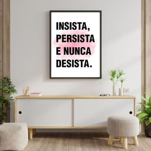 Quadro insista, persista e nunca desista 45x34cm - com vidro Moldura: madeira preta Informações do produto tire todas as suas dúvidas no descritivo abaixo: decoração para quarto, sala, cozinha, escritório, área gourmet e muito mais. Chega de paredes vazias medidas - cada peça tem 45x34cm a3 . Material do papel - papel fotográfico brilhante de altíssima resolução acabamento - todos os quadros são acompanhados de vidro para proteção da imagem. - moldura em madeira maciça na cor preta e pendurador . - os quadros são embalados de forma segura com plástico bolha com camada dupla de acordo com o tamanho dos quadros. - de 3 meses. Meu quadro chegou. Como posso fixá-lo Você precisa apenas de um martelo e um prego, pois os quadros já vão acompanhados de penduradores. Esta é a forma mais indicada. Como posso limpar meu quadro A limpeza é feita como um móvel comum da sua casa. Apenas um pano seco ou espanador são suficientes para tal
