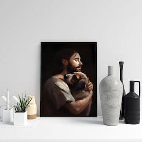 Quadro jesus abraçando cachorro 45x34cm Moldura: madeira preta Informações do produto tire todas as suas dúvidas no descritivo abaixo: decoração para quarto, sala, cozinha, escritório, área gourmet e muito mais. Chega de paredes vazias. Medidas - cada peça tem 45x34cm a3 . Material do papel - papel fotográfico brilhante de altíssima resolução acabamento - todos os quadros são acompanhados de uma película de acetato para proteção da imagem. - os quadros são embalados de forma segura com plástico bolha com camada dupla de acordo com o tamanho dos quadros. Garantia - garantia de 3 meses. Meu quadro chegou. Como posso fixá-lo Você precisa apenas de um martelo e um prego, pois os quadros já vão acompanhados de penduradores. Esta é a forma mais indicada. Caso prefira, você pode utilizar uma fita dupla face neste caso, sugerimos de alta qualidade para evitar que descole e seu quadro caia . Como posso limpar meu quadro A limpeza é feita como um móvel comum da sua casa. Apenas um pano seco ou espanador são suficientes para tal
