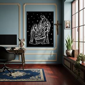 Quadro Jesus, Maria e José - Noite Estrelada - 70x50cm - Cor: Moldura Branca