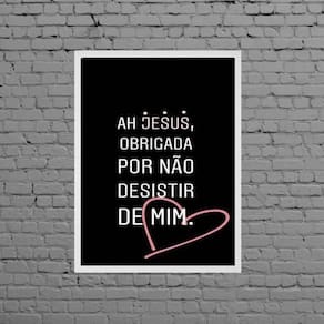 Quadro jesus obrigada por não desistir 33x24cm - com vidro Moldura: madeira branca Informações do produto tire todas as suas dúvidas no descritivo abaixo: decoração para quarto, sala, cozinha, escritório, área gourmet e muito mais. Chega de paredes vazias medidas - cada peça tem 33x24cm a4 . Material do papel - papel fotográfico brilhante de altíssima resolução acabamento - todos os quadros são acompanhados de vidro para proteção da imagem. - moldura em madeira maciça na cor preta e pendurador . - os quadros são embalados de forma segura com plástico bolha com camada dupla de acordo com o tamanho dos quadros. - de 3 meses. Meu quadro chegou. Como posso fixá-lo Você precisa apenas de um martelo e um prego, pois os quadros já vão acompanhados de penduradores. Esta é a forma mais indicada. Como posso limpar meu quadro A limpeza é feita como um móvel comum da sua casa. Apenas um pano seco ou espanador são suficientes para tal Ean: 7895142251150