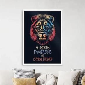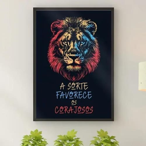 Quadro leão sorte favorece corajosos 33x24cm Cor: moldura preta Informações do produto tire todas as suas dúvidas no descritivo abaixo: decoração para quarto, sala, cozinha, escritório, área gourmet e muito mais. Chega de paredes vazias medidas - cada peça tem 33x24cm a4 . Material do papel - papel fotográfico brilhante de altíssima resolução acabamento - todos os quadros são acompanhados de uma película de acetato para proteção da imagem. - os quadros são embalados de forma segura com plástico bolha com camada dupla de acordo com o tamanho dos quadros. Garantia - garantia de 3 meses. Meu quadro chegou. Como posso fixá-lo Você precisa apenas de um martelo e um prego, pois os quadros já vão acompanhados de penduradores. Esta é a forma mais indicada. Caso prefira, você pode utilizar uma fita dupla face neste caso, sugerimos de alta qualidade para evitar que descole e seu quadro caia . Como posso limpar meu quadro A limpeza é feita como um móvel comum da sua casa. Apenas um pano seco ou espanador são suficientes para tal
