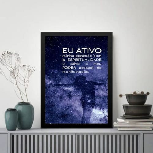 Quadro lei da atração - eu ativo 33x24cm - com vidro Cor: moldura branca Informações do produto tire todas as suas dúvidas no descritivo abaixo: decoração para quarto, sala, cozinha, escritório, área gourmet e muito mais. Chega de paredes vazias medidas - cada peça tem 33x24cm a4 . Material do papel - papel fotográfico brilhante de altíssima resolução acabamento - todos os quadros são acompanhados de vidro para proteção da imagem. - moldura em madeira maciça na cor preta ou branca conforme produto escolhido e pendurador . - os quadros são embalados de forma segura com plástico bolha com camada dupla de acordo com o tamanho dos quadros. Garantia - garantia de 3 meses. Meu quadro chegou. Como posso fixá-lo Você precisa apenas de um martelo e um prego, pois os quadros já vão acompanhados de penduradores. Esta é a forma mais indicada. Como posso limpar meu quadro A limpeza é feita como um móvel comum da sua casa. Apenas um pano seco ou espanador são suficientes para tal Ean: 7895630314879