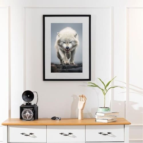 Quadro lobo feroz - 60x48cm Cor: moldura branca Informações do produto tire todas as suas dúvidas no descritivo abaixo: decoração para quarto, sala, cozinha, escritório, área gourmet e muito mais. Chega de paredes vazias medidas - cada peça tem 60x48cm . Material do papel - papel fotográfico brilhante de altíssima resolução acabamento - todos os quadros são acompanhados de vidro para proteção da imagem. - moldura em madeira maciça na cor preta ou branca conforme produto escolhido e pendurador. - paspatur branco com 7cm de largura - os quadros são embalados de forma segura com plástico bolha com camada dupla de acordo com o tamanho dos quadros. Garantia - garantia de 3 meses. Meu quadro chegou. Como posso fixá-lo Você precisa apenas de um martelo e um prego, pois os quadros já vão acompanhados de penduradores. Esta é a forma mais indicada. Como posso limpar meu quadro A limpeza é feita como um móvel comum da sua casa. Apenas um pano seco ou espanador são suficientes para tal