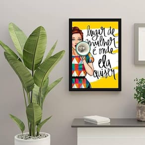 Quadro lugar de mulher é onde ela quiser 45x34cm - com vidro Moldura: madeira preta Informações do produto tire todas as suas dúvidas no descritivo abaixo: decoração para quarto, sala, cozinha, escritório, área gourmet e muito mais. Chega de paredes vazias medidas - cada peça tem 45x34cm a3 . Material do papel - papel fotográfico brilhante de altíssima resolução acabamento - todos os quadros são acompanhados de vidro para proteção da imagem. - moldura em madeira maciça na cor preta e pendurador . - os quadros são embalados de forma segura com plástico bolha com camada dupla de acordo com o tamanho dos quadros. - de 3 meses. Meu quadro chegou. Como posso fixá-lo Você precisa apenas de um martelo e um prego, pois os quadros já vão acompanhados de penduradores. Esta é a forma mais indicada. Como posso limpar meu quadro A limpeza é feita como um móvel comum da sua casa. Apenas um pano seco ou espanador são suficientes para tal Marca: Não Informado