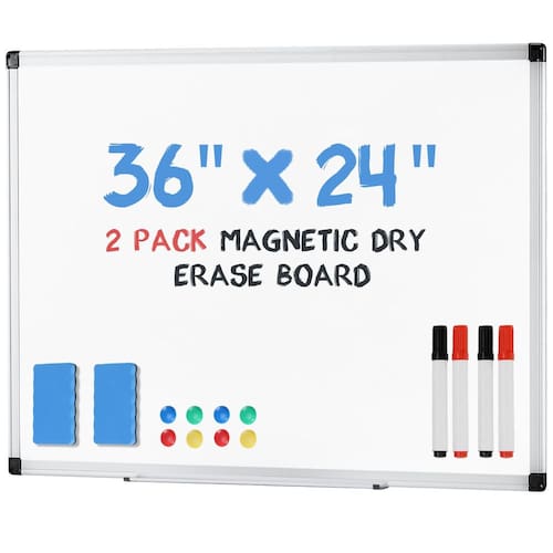 DUMOS Pacote com 2 kits de quadro branco magnético para parede de 91 cm x 61 cm, quadro apagável a seco com 1 borracha a seco, 2 marcadores multicoloridos e 4 pinos magnéticos, moldura de alumínio