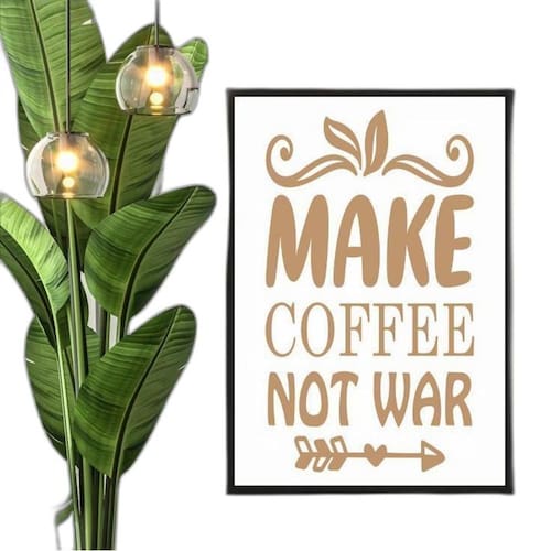 Quadro make coffee not war 33x24cm Cor: moldura preta Informações do produto tire todas as suas dúvidas no descritivo abaixo: decoração para quarto, sala, cozinha, escritório, área gourmet e muito mais. Chega de paredes vazias medidas - cada peça tem 33x24cm a4 . Material do papel - papel fotográfico brilhante de altíssima resolução acabamento - todos os quadros são acompanhados de uma película de acetato para proteção da imagem. - os quadros são embalados de forma segura com plástico bolha com camada dupla de acordo com o tamanho dos quadros. - de 3 meses. Meu quadro chegou. Como posso fixá-lo Você precisa apenas de um martelo e um prego, pois os quadros já vão acompanhados de penduradores. Esta é a forma mais indicada. Caso prefira, você pode utilizar uma fita dupla face neste caso, sugerimos de alta qualidade para evitar que descole e seu quadro caia . Como posso limpar meu quadro A limpeza é feita como um móvel comum da sua casa. Apenas um pano seco ou espanador são suficientes para tal Marca: Não Informado
