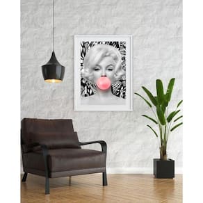 Quadro marilyn monroe bubble gum geométrico 60x48cm Moldura: madeira branca Informações do produto tire todas as suas dúvidas no descritivo abaixo: decoração para quarto, sala, cozinha, escritório, área gourmet e muito mais. Chega de paredes vazias medidas - cada peça tem 60x48cm . Material do papel - papel fotográfico brilhante de altíssima resolução acabamento - todos os quadros são acompanhados de vidro para proteção da imagem. - moldura em madeira maciça na cor preta ou branca conforme produto escolhido e pendurador. - paspatur branco com 7cm de largura - os quadros são embalados de forma segura com plástico bolha com camada dupla de acordo com o tamanho dos quadros. Garantia - garantia de 3 meses. Meu quadro chegou. Como posso fixá-lo Você precisa apenas de um martelo e um prego, pois os quadros já vão acompanhados de penduradores. Esta é a forma mais indicada. Como posso limpar meu quadro A limpeza é feita como um móvel comum da sua casa. Apenas um pano seco ou espanador são suficientes para tal