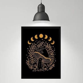 Quadro místico cogumelo - fases da lua 24x18cm Moldura: madeira preta Informações do produto tire todas as suas dúvidas no descritivo abaixo: decoração para quarto, sala, cozinha, escritório, área gourmet e muito mais. Chega de paredes vazias medidas - cada peça tem 24x18cm a5 . Material do papel - papel fotográfico brilhante de altíssima resolução acabamento - todos os quadros são acompanhados de uma película de acetato para proteção da imagem. - os quadros são embalados de forma segura com plástico bolha com camada dupla de acordo com o tamanho dos quadros. Garantia - garantia de 3 meses. Meu quadro chegou. Como posso fixá-lo Você precisa apenas de um martelo e um prego, pois os quadros já vão acompanhados de penduradores. Esta é a forma mais indicada. Caso prefira, você pode utilizar uma fita dupla face neste caso, sugerimos de alta qualidade para evitar que descole e seu quadro caia . Como posso limpar meu quadro A limpeza é feita como um móvel comum da sua casa. Apenas um pano seco ou espanador são suficientes para tal