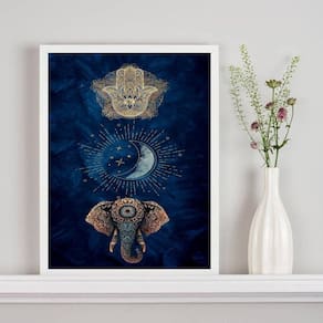 Quadro mistico hamsa lua elefante 33x24cm - com vidro Cor: moldura branca Informações do produto tire todas as suas dúvidas no descritivo abaixo: decoração para quarto, sala, cozinha, escritório, área gourmet e muito mais. Chega de paredes vazias medidas - cada peça tem 33x24cm a4 . Material do papel - papel fotográfico brilhante de altíssima resolução acabamento - todos os quadros são acompanhados de vidro para proteção da imagem. - moldura em madeira maciça na cor preta ou branca conforme produto escolhido e pendurador . - os quadros são embalados de forma segura com plástico bolha com camada dupla de acordo com o tamanho dos quadros. - de 3 meses. Meu quadro chegou. Como posso fixá-lo Você precisa apenas de um martelo e um prego, pois os quadros já vão acompanhados de penduradores. Esta é a forma mais indicada. Como posso limpar meu quadro A limpeza é feita como um móvel comum da sua casa. Apenas um pano seco ou espanador são suficientes para tal Marca: Não Informado