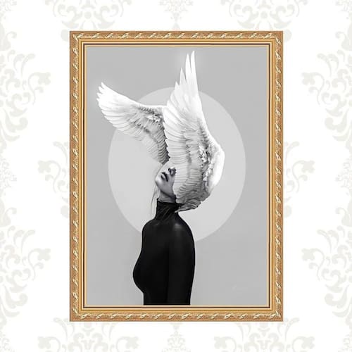 Quadro moldura dourada mulher com asas 45x34cm Acabamento: com acetato Informações do produto tire todas as suas dúvidas no descritivo abaixo: decoração para quarto, sala, cozinha, escritório, área gourmet e muito mais. Chega de paredes vazias. Medidas - cada peça tem 45x34cm a3 . Material do papel - papel fotográfico brilhante de altíssima resolução acabamento - todos os quadros são acompanhados de vidro ou uma película de acetato para proteção da imagem conforme escolha . - os quadros são embalados de forma segura com plástico bolha com camada dupla de acordo com o tamanho dos quadros. Garantia - garantia de 3 meses. Meu quadro chegou. Como posso fixá-lo Você precisa apenas de um martelo e um prego, pois os quadros já vão acompanhados de penduradores. Esta é a forma mais indicada. Caso prefira, você pode utilizar uma fita dupla face neste caso, sugerimos de alta qualidade para evitar que descole e seu quadro caia . Como posso limpar meu quadro A limpeza é feita como um móvel comum da sua casa. Apenas um pano seco ou espanador são suficientes para tal