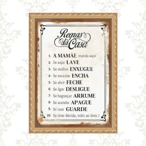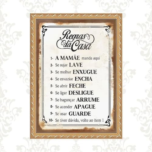Quadro moldura dourada regras da casa 24x18cm Acabamento: com vidro Informações do produto tire todas as suas dúvidas no descritivo abaixo: decoração para quarto, sala, cozinha, escritório, área gourmet e muito mais. Chega de paredes vazias medidas - cada peça tem 24x18cm a5 . Material do papel - papel fotográfico brilhante de altíssima resolução acabamento - todos os quadros são acompanhados de vidro ou uma película de acetato para proteção da imagem conforme escolha . - os quadros são embalados de forma segura com plástico bolha com camada dupla de acordo com o tamanho dos quadros. Garantia - garantia de 3 meses. Meu quadro chegou. Como posso fixá-lo Você precisa apenas de um martelo e um prego, pois os quadros já vão acompanhados de penduradores. Esta é a forma mais indicada. Caso prefira, você pode utilizar uma fita dupla face neste caso, sugerimos de alta qualidade para evitar que descole e seu quadro caia . Como posso limpar meu quadro A limpeza é feita como um móvel comum da sua casa. Apenas um pano seco ou espanador são suficientes para tal