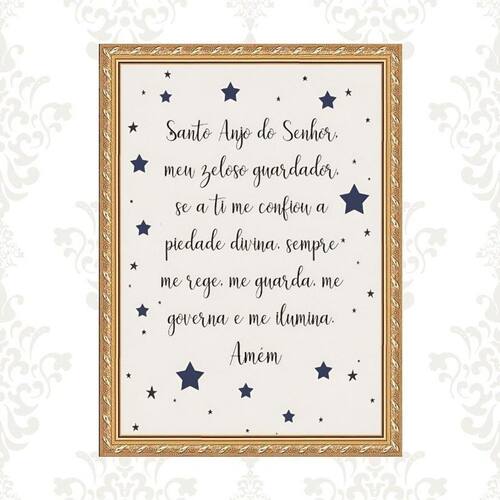 Quadro moldura dourada santo anjo estrelinhas 24x18cm Acabamento: com vidro Informações do produto tire todas as suas dúvidas no descritivo abaixo: decoração para quarto, sala, cozinha, escritório, área gourmet e muito mais. Chega de paredes vazias medidas - cada peça tem 24x18cm a5 . Material do papel - papel fotográfico brilhante de altíssima resolução acabamento - todos os quadros são acompanhados de vidro ou uma película de acetato para proteção da imagem conforme escolha . - os quadros são embalados de forma segura com plástico bolha com camada dupla de acordo com o tamanho dos quadros. Garantia - garantia de 3 meses. Meu quadro chegou. Como posso fixá-lo Você precisa apenas de um martelo e um prego, pois os quadros já vão acompanhados de penduradores. Esta é a forma mais indicada. Caso prefira, você pode utilizar uma fita dupla face neste caso, sugerimos de alta qualidade para evitar que descole e seu quadro caia . Como posso limpar meu quadro A limpeza é feita como um móvel comum da sua casa. Apenas um pano seco ou espanador são suficientes para tal